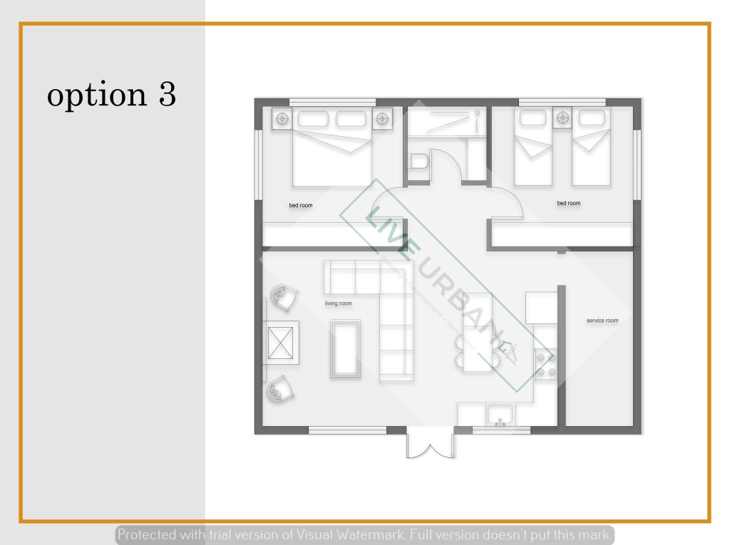 This layout provides a large living area that spans the length of the home. The front bedroom can be used for a variety of purposes. A second sink is provided outside the main bathroom to allow for multiple users at the same time. A second access point can be placed in either the kitchen or service room.