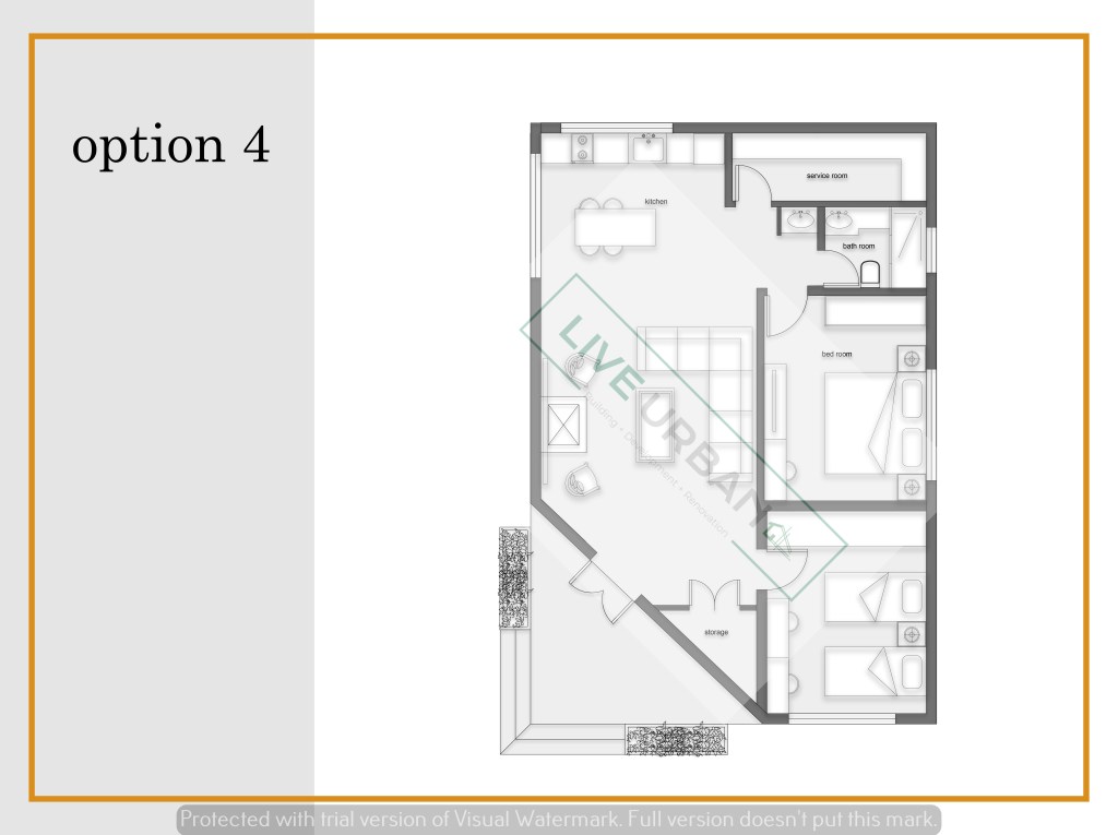 This unit can be flipped, or clerestory windows added along the front house line to create higher ceilings and a fantastic sense of light inside the home. A second access can be provided either within the bedroom or to the sideyard from the kitchen. Laundry can be provided in the service room. Don’t miss the large closet!